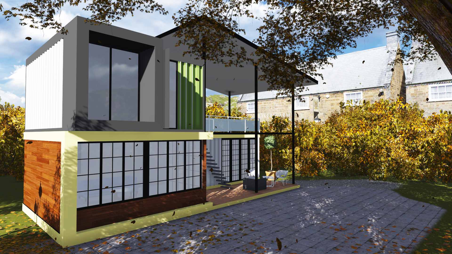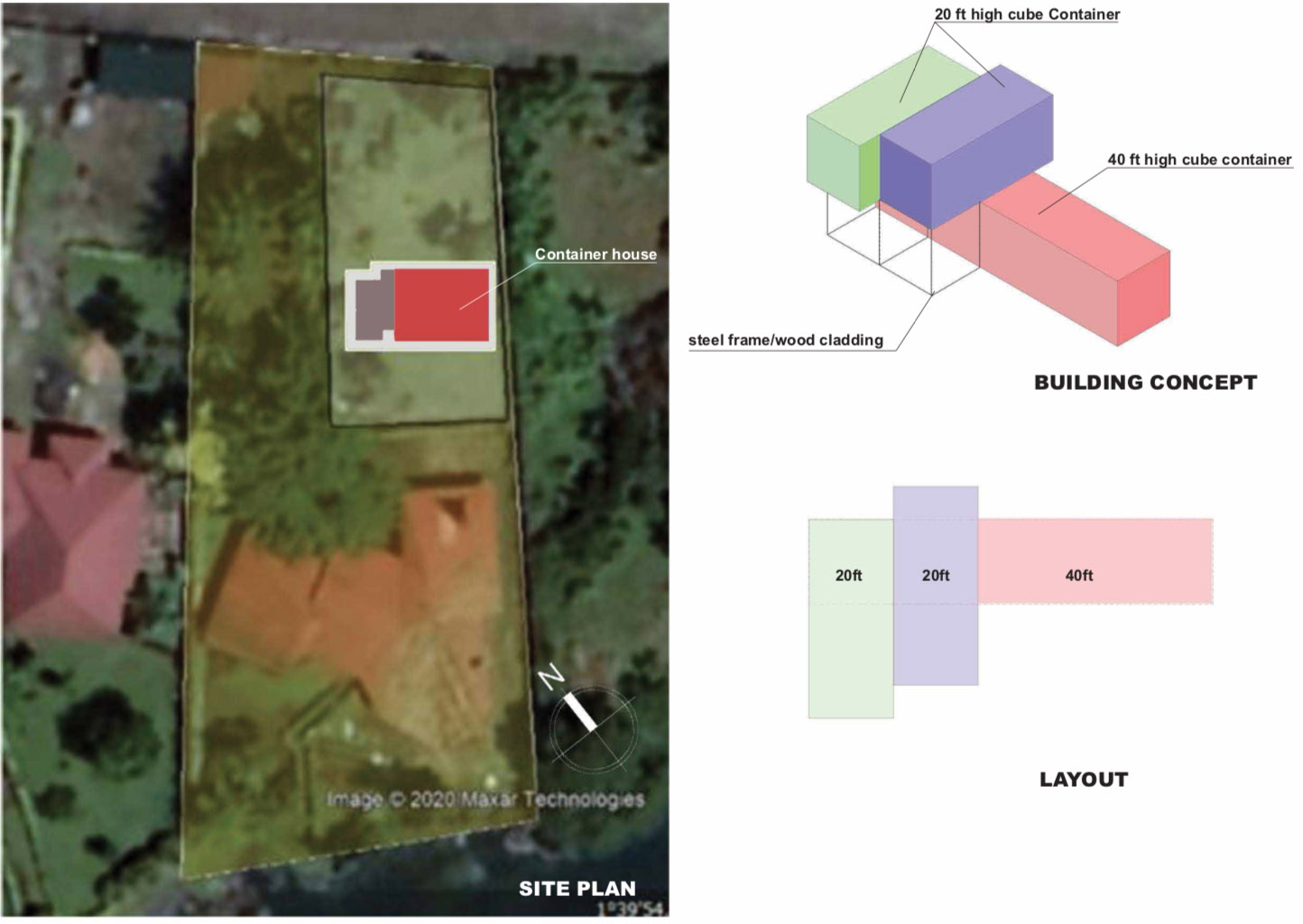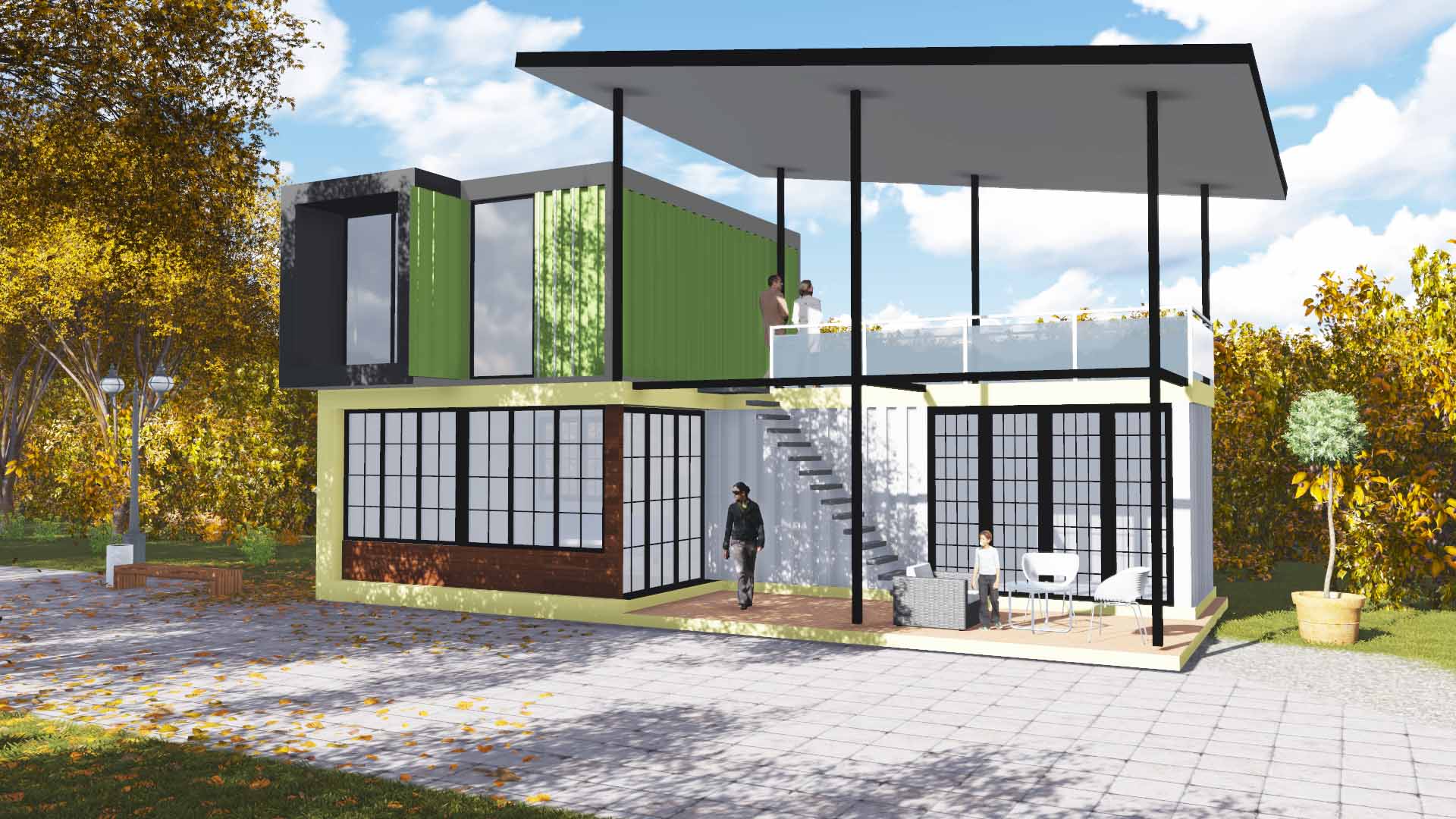 This is a proposal guest house that should accommodate a family of four. The design uses a 40ft High Cube container and 2x20ft containers to create a living room, bedroom and shower on the ground floor, and there is a loft on the first floor.