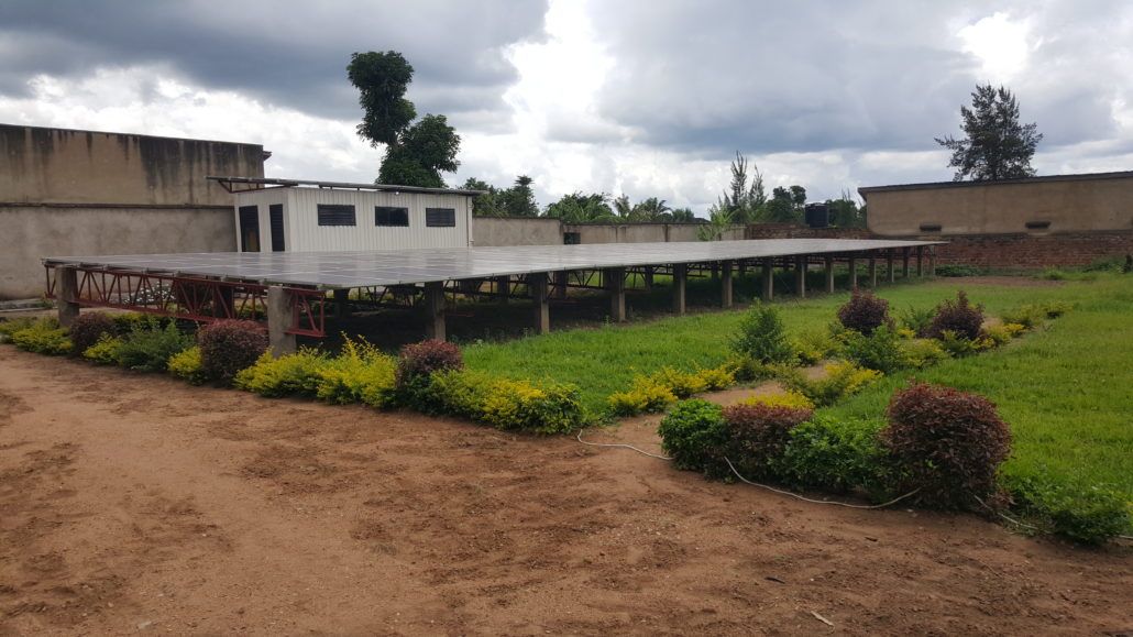 Solar panel support structure and battery storage unit for Nuru‘s 65KW solar minigrid in Beni, Congo (DRC).